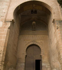 Access from the city to the Alhambra Park is afforded by the Puerta de las Granadas (Gate of Pomegranates), a triumphal arch dating from the 15th century. A steep ascent leads past the Pillar of Charles V, a fountain erected in 1554, to the main entrance of the Alhambra. This is the Puerta de la Justicia (Gate of Judgment), a massive horseshoe archway surmounted by a square tower and used by the Moors as an informal court of justice. The hand of Fatima, with fingers outstretched as a talisman against the evil eye, is carved above this gate on the exterior; a key, the symbol of authority, occupies the corresponding place on the interior. A narrow passage leads inward to the Plaza de los Aljibes (Place of the Cisterns), a broad open space which divides the Alcazaba from the Moorish palace. To the left of the passage rises the Torre del Vino (Wine Tower), built in 1345 and used in the 16th century as a cellar. On the right is the palace of Charles V, a smaller Renaissance building.